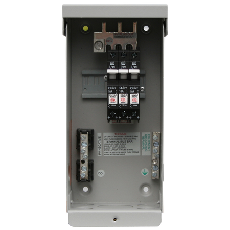 Gray aluminum type 3R rainproof enclosure with deadfront will accept three 150VDC breakers or two 600 VDC fuse holders. DIN rail mounted.