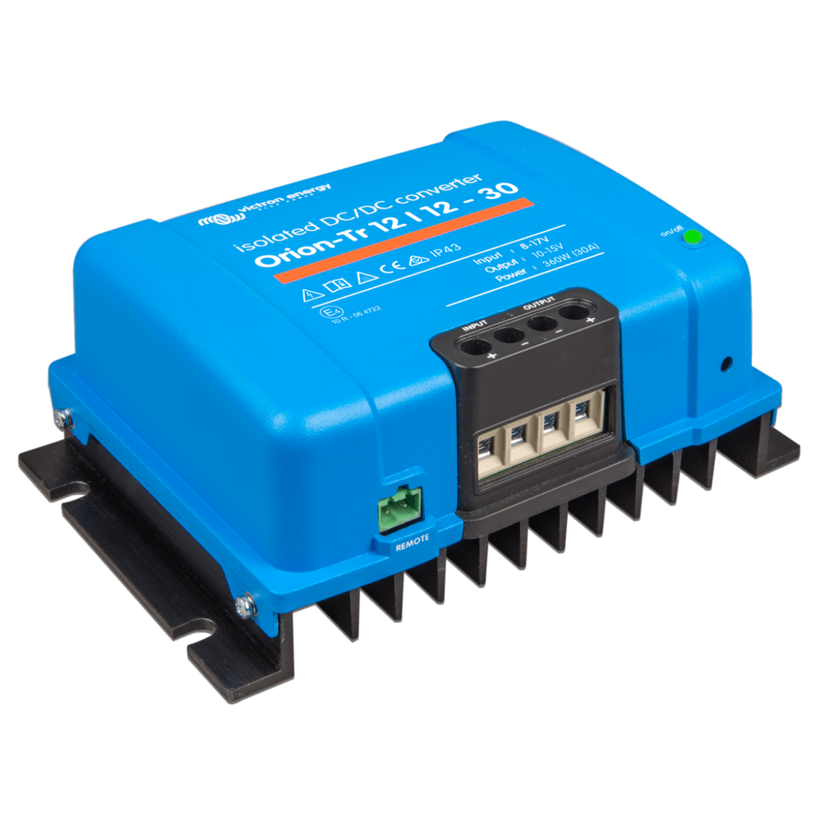 The Victron Energy Orion-Tr 12V to 12V 30A DC-DC Converter is a powerful DC-DC isolated converter with many advanced features and remote on-off capabilities in a compact enclosure for off-grid, grid-tie battery back-up, marine or RV use. Features include adjustable output voltage, ability to charge a starter battery, short circuit proof for unlimited parallel operation to increase output current, high temperature electronics protection, input fuse (not replaceable) on 12V and 24V (48V requires external fuse or breaker), ease of install and proven Victron reliability. The remote on-off eliminates the need for a high current switch in the input wiring. The remote on-off can be operated with a low power switch or by, for example, an engine run/stop switch.