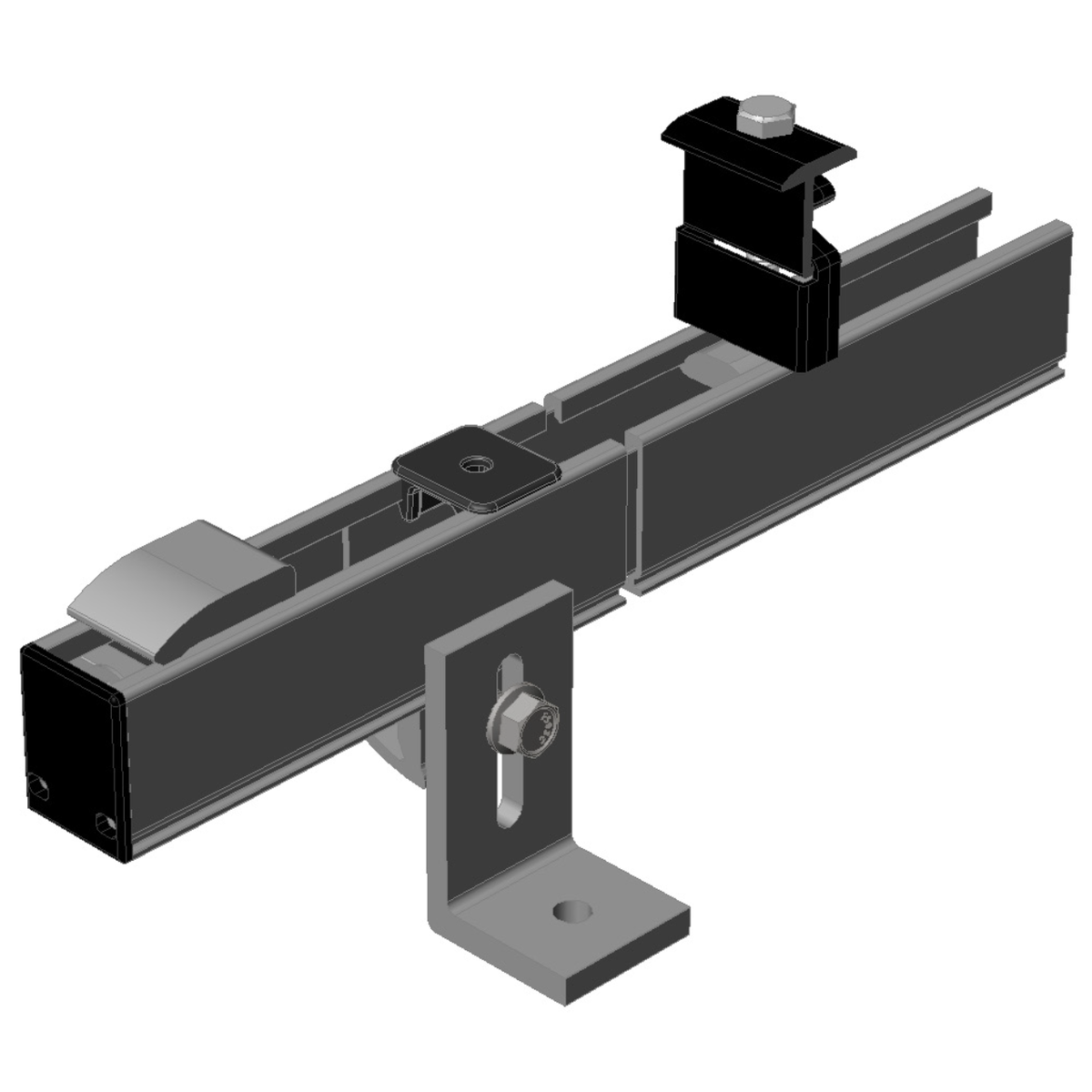 Tamarack Solar Products offers a new low-cost rail based PV module mounting system that provides easy installation, simple wire management, great strength and economical shipping. These rail kits contain all parts required to mount 2 typical 60-cell or 72-cell modules. Sliding clamps hold the panel frames to the rails. Rail mounts with L-feet connect with a variety of feet to serve as the mounting points which secure the entire assembly to the roof. Optional roof attachments for alternative roofing materials are available separately. This product has a black finish.