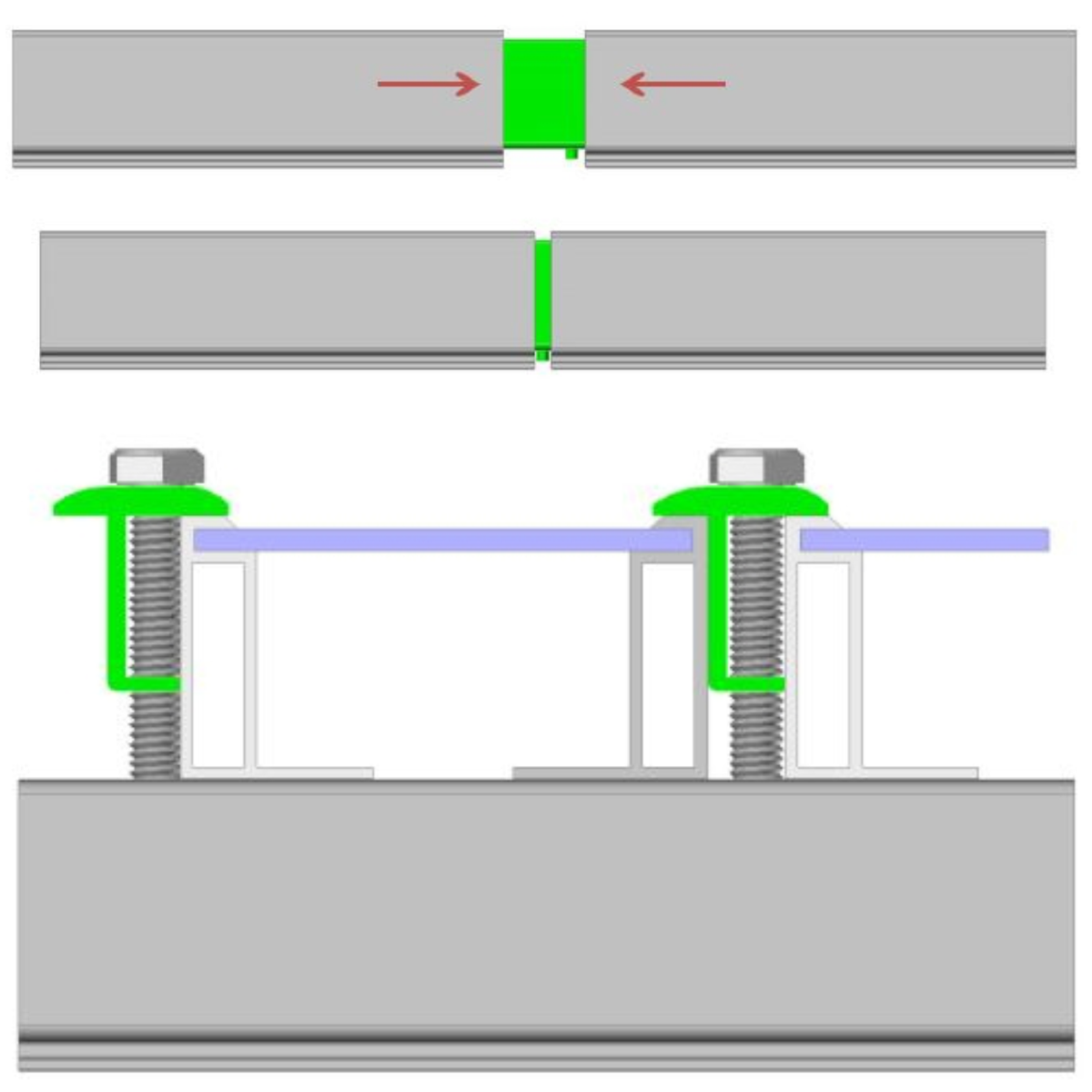 The channeled design of the aluminum rails allows the position of the feet to be easily adjusted so that penetrations into the roof itself can be aligned to hit structural timbers for the strongest attachment possible.