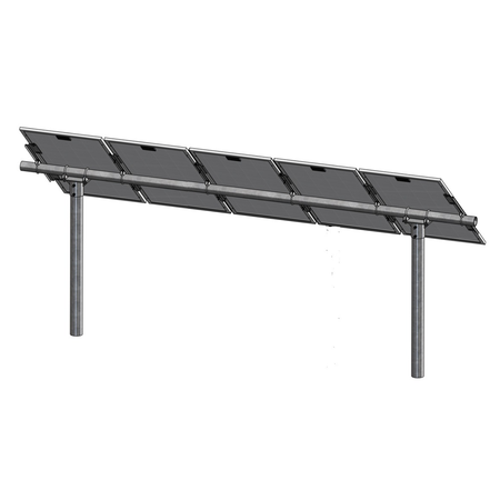 This popular PGRM Mount is designed for mounting five solar modules in portrait orientation on two posts. Engineered for tilt angles ranging from 10° to 60° and allows easy seasonal adjustability. Clamp attachment uses the lip on the back of module frame and accommodates frame thickness between 1.18-inches and 2-inches. See data sheet for more information.